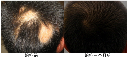 蔣先生,40歲,河北人。蔣先生20多歲的時候,就有掉頭發,而且掉的很厲害,后來就形成了斑禿。困惱了多年,一直沒有找到好的治療方法。看到很多廣告說可以生發長發,于是買回來試試,結果試了一種又一種,效果卻并不明顯。2008年來到我院,我院車傳華主任經過診斷,為其施予"中西醫結合毛發自我再生法"治療,也對蔣先生的作息很飲食習慣做了一些規定,積極配合,不久之后蔣先生斑禿部位長出新發,斑禿消失。