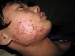 2、丘疹型:常見的皮膚損害以發炎的小丘疹為主,高出皮膚,大小有如米粒到豌豆大,較密集,有的也較堅硬,顏色是淡紅色或深紅色,有時在丘疹中央可以看到黑頭或頂端發黑的皮脂栓,時有癢或疼痛感。