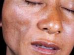 二、皮膚和粘膜:皮疹常見,約40%患者有面部典型紅斑稱為蝶形紅斑.急性期有水腫、色鮮紅,略有毛細(xì)血管擴(kuò)張及磷片狀脫屑,嚴(yán)重者出現(xiàn)水皰、潰瘍、皮膚萎縮和色素沉著.手掌大小魚際、指端及指(趾)甲周紅斑,身體皮膚暴露部位有斑丘疹、紫斑等.出現(xiàn)各種皮膚損害者約占總患病數(shù)的80%,毛發(fā)易斷裂,可有斑禿.