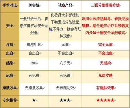 三聯分型排毒療法運用中醫藥調理結合青春痘光動力理療治療系統,可同時達到排毒,殺菌,抑菌、修復受損細胞、恢復皮膚生態平衡、祛痘不留痕的多重功效,而且對青春痘各期,各個致病環節,以及青春痘印記,青春痘凹疤均可進行全面系統的治療。