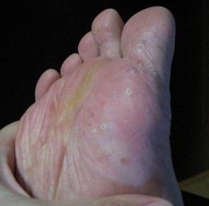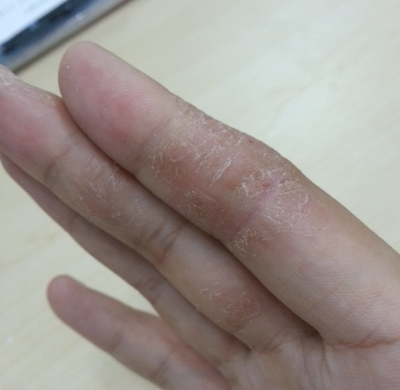 第三種是浸漬型的:主要表現為腳趾間手指間皮膚發白,出現糜爛、浸漬,邊緣清楚,去除浸漬的表皮,留下潮濕的鮮紅新生皮膚。