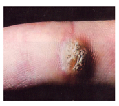 尋常疣好發于手、足部,開始為單個,可因自身接種而增多。皮損為圓形或多角形的丘疹,從針尖到花生大小,灰黃、污褐色或正常膚色,周圍無紅暈,表面粗糙,角化明顯,呈花蕊或刺狀,觸之稍硬,有刺手感,但不會像刺猬的硬毛那么尖硬。